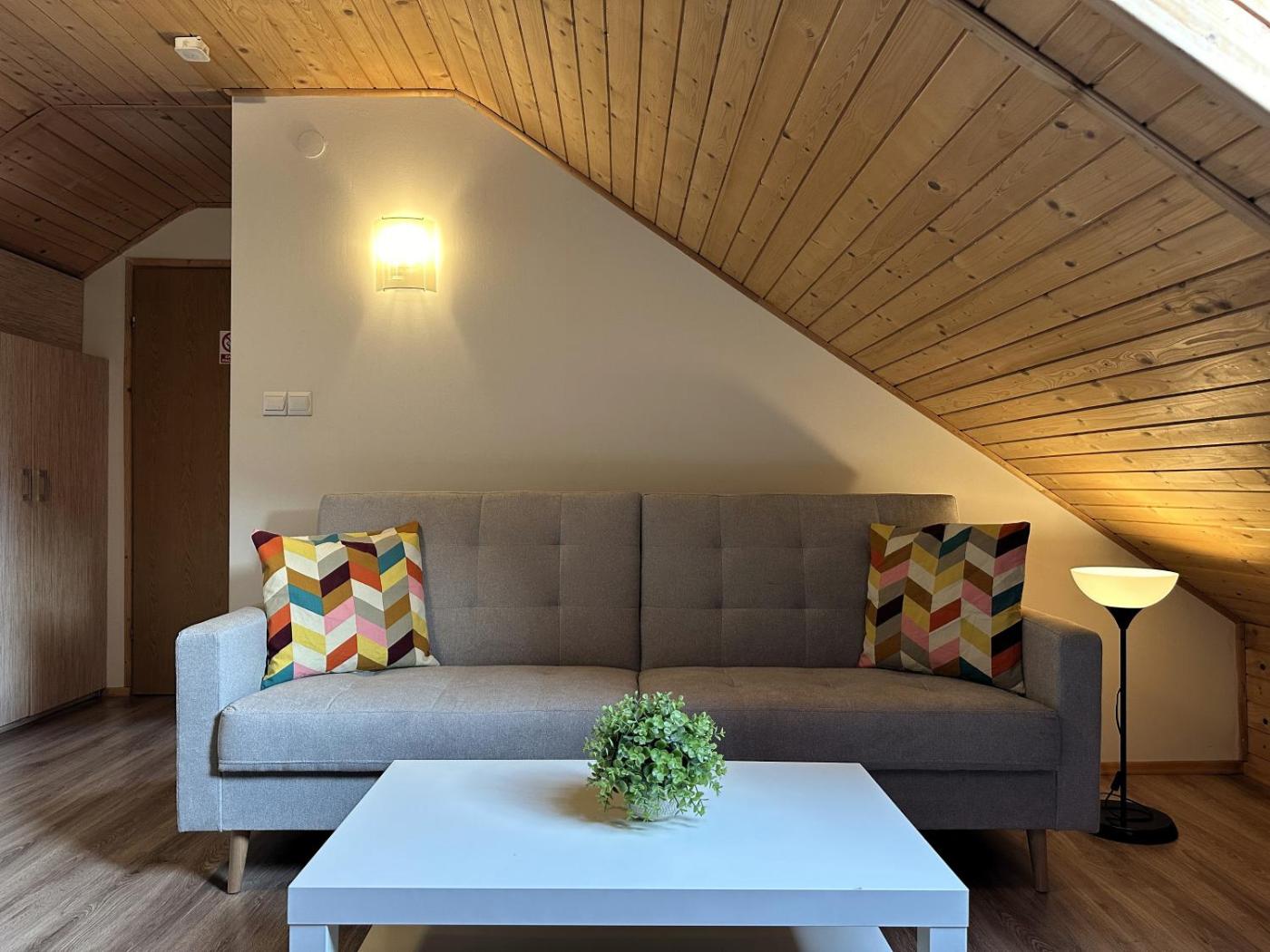 Apartament typu Penthouse. Ten urządzony w drewnie apartament mieści się na poddaszu i ma okna dachowe, przez które można podziwiać widok na okolicę. Apartament składa się z sypialni, salonu oraz aneksu kuchennego z lodówką, kuchenką mikrofalową i elektryczną płytą kuchenną. Do dyspozycji Gości jest również czajnik oraz łazienka z prysznicem i toaletą. Apartament - 3 osobowy. Powierzchnia pokoju ok.: 35 mkw. ;